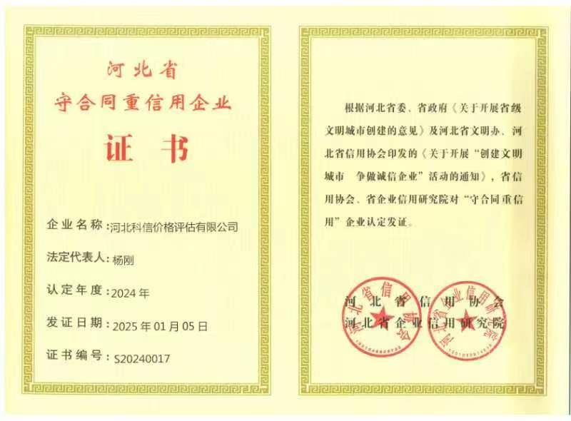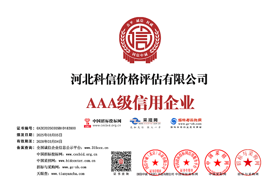 河北科信價格評估有限公司為"AAA"級信用企業(yè),具有商務部、文化部備案,頒發(fā)相關鑒定與專業(yè)評估資質,由河北省價格評估行業(yè)協(xié)會頒發(fā)的“甲級”《價格評估機構執(zhí)業(yè)登記證書》。公司是河北省價格評估行業(yè)協(xié)會常務理事單位,河北省科技型中小企業(yè),河北省政府中介超市入冊鑒定評估機構、唐山市政府中介超市入冊的鑒定評估機構、唐山仲裁委員會入冊鑒定評估機構。依法在唐山工商行政管理部門注冊登記的獨立第三方評估機構。公司成立于2015年,注冊資金300萬元人民幣,公司擁有多名價格鑒證師、價格評估專業(yè)人員、國家高級、中級機動車鑒定評估師、中級涉案財物評估師、汽車估損師、保險公估師、高級林業(yè)工程師等,為您提供專業(yè)優(yōu)質的服務,公司嚴格按照程序組織實施鑒定評估以及合法的市場調查業(yè)務,所出具的價格評估報告書、意見書具有法律效力并為國家認可。公司自成立以來共接受河北省交警系統(tǒng)、法院系統(tǒng)、檢察院系統(tǒng)、交通局系統(tǒng)、財政系統(tǒng)、銀行系統(tǒng)以及社會各界人士的各類委托3000余件,受到一致好評。在執(zhí)業(yè)過程中,我們將依照相關的法律、法規(guī),嚴格遵循客觀、獨立、公正、公平、科學性的原則;竭誠為您提供專業(yè)、權威的價格評估服務和信息咨詢服務;為您提供專業(yè)、快捷的優(yōu)質服務。